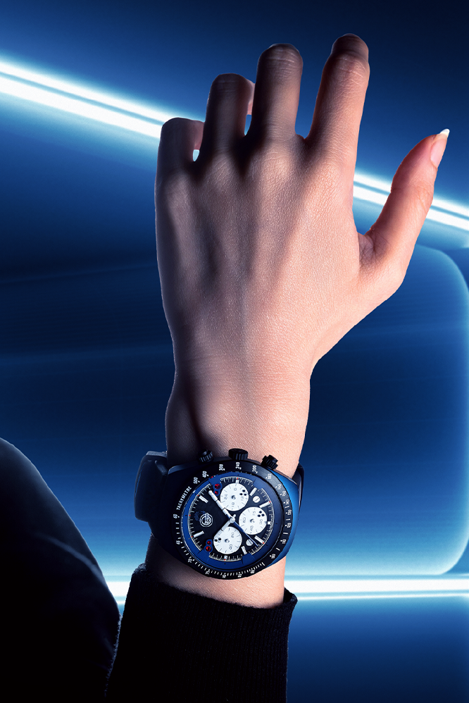 Designed from 316L stainless steel, the case color mirrors the Tachikoma’s distinctive body, while the tricompax dial pays homage to the AI tank’s three “eyeballs.”