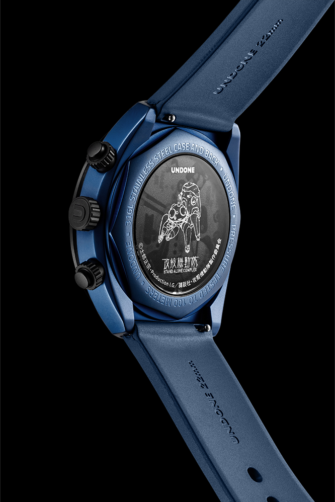 The hour, minute, and second hands are shaped after the Tachikoma’s body parts, while subtle engravings of the Laughing Man and the Section 9 emblems celebrate the core motifs of S.A.C..