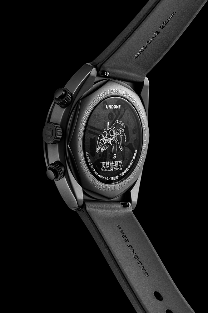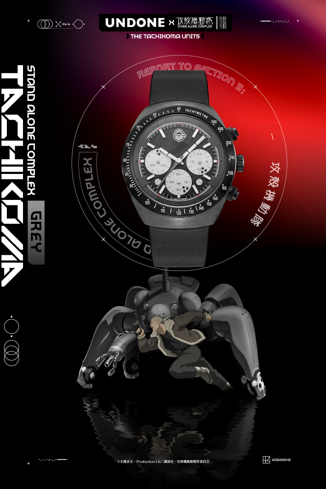 The hour, minute, and second hands are shaped after the Tachikoma’s antenna and manipulator arms, while subtle engravings of the Laughing Man and the Section 9 emblems celebrate the core motifs of S.A.C..