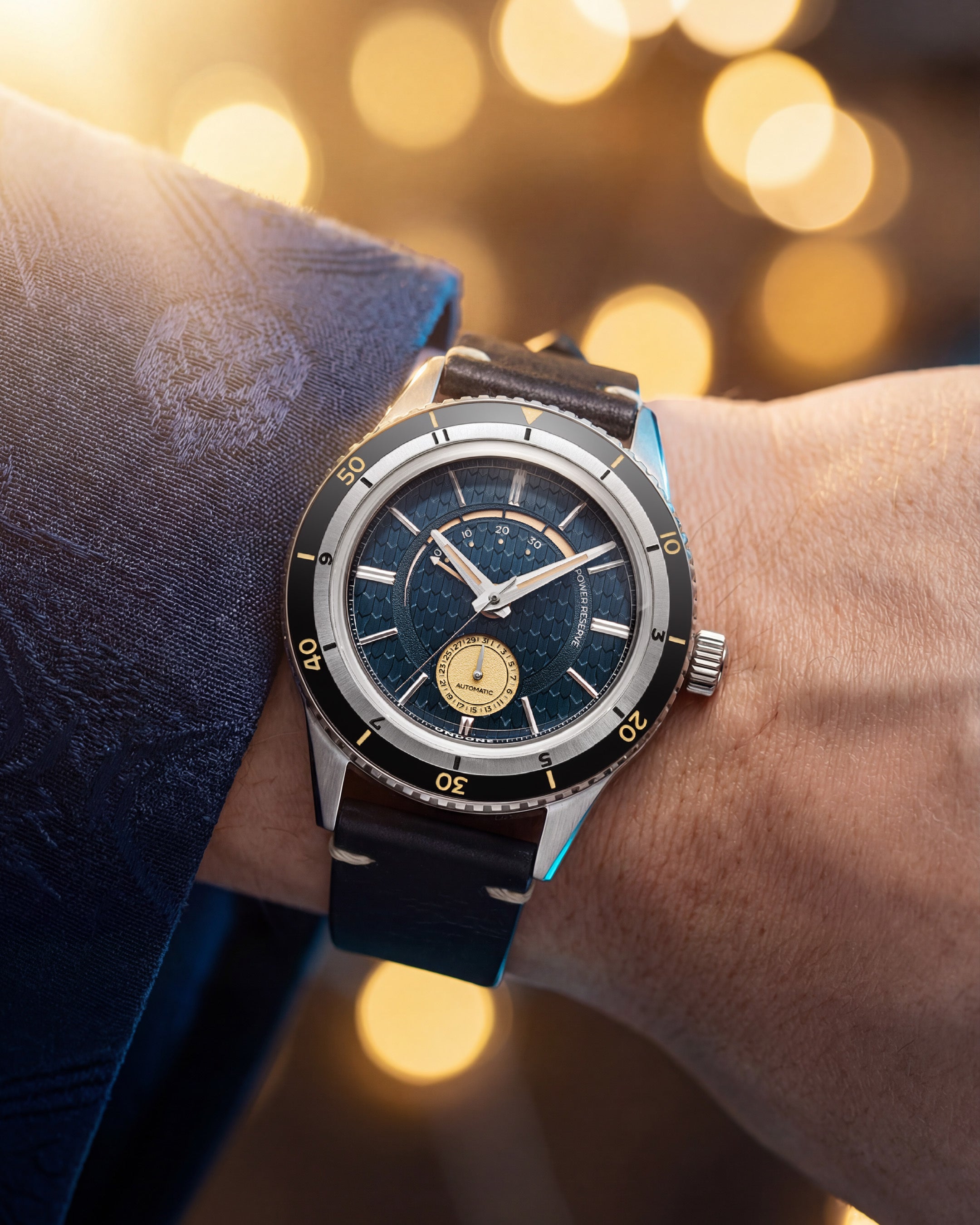 The dial surface reflects this same discipline through layered textures and controlled finishes. Vertical brushing and structured patterns add depth without shine, allowing light to move calmly across the surface. Nothing decorative. Everything intentional.