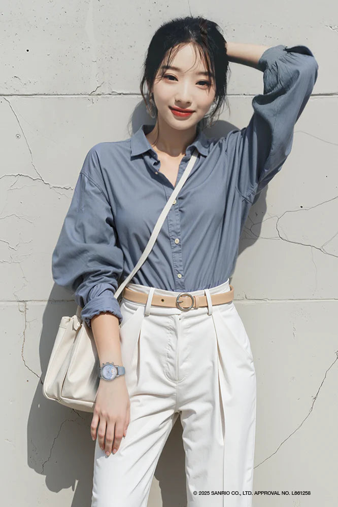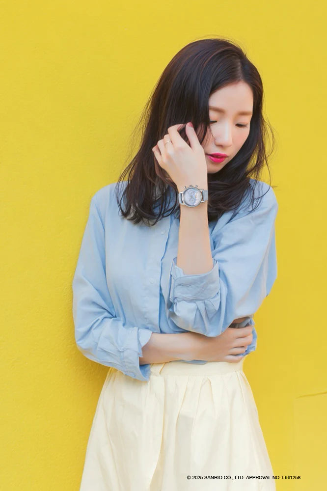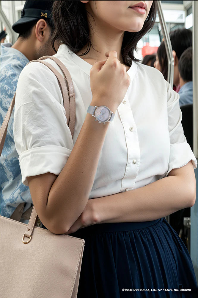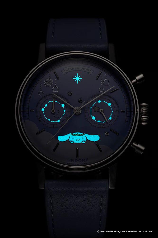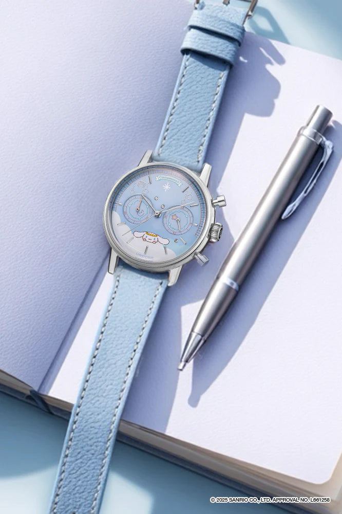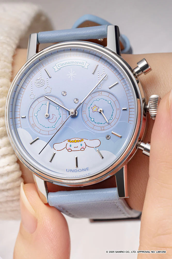 The “UNDONE × Cinnamoroll Watch – Starry Marshmallow” is a quartz watch featuring a light blue dial with a constellation design and a comfortable leather strap that enhances its charm.